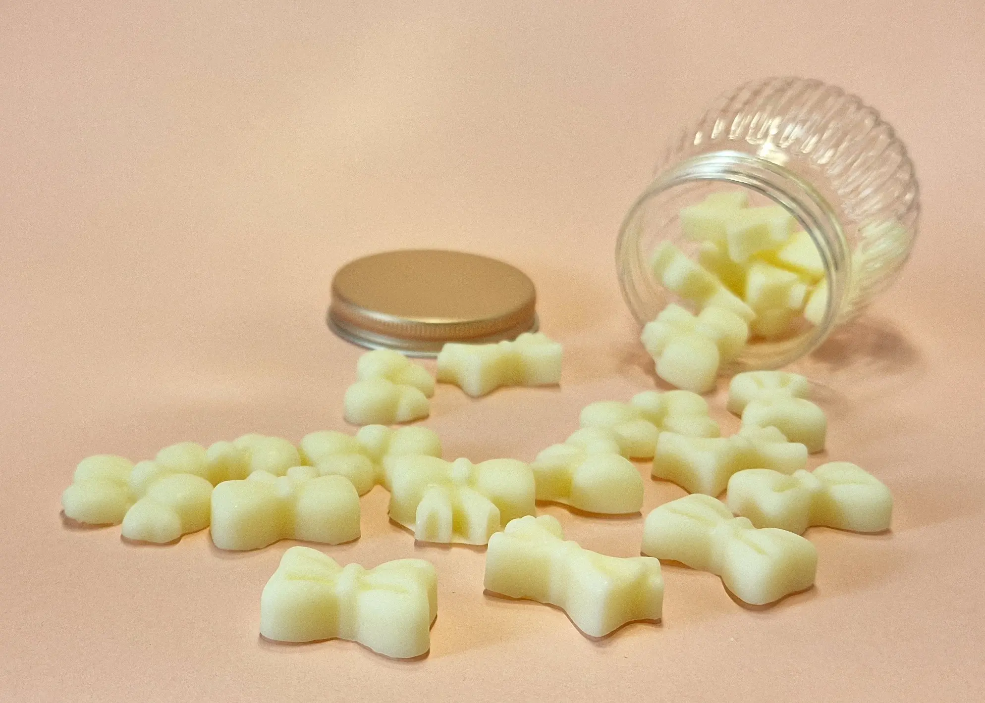 Bow-shaped melts release a warm vanilla scent, while daisy-shaped melts offer a fresh, tropical pineapple & coconut aroma.