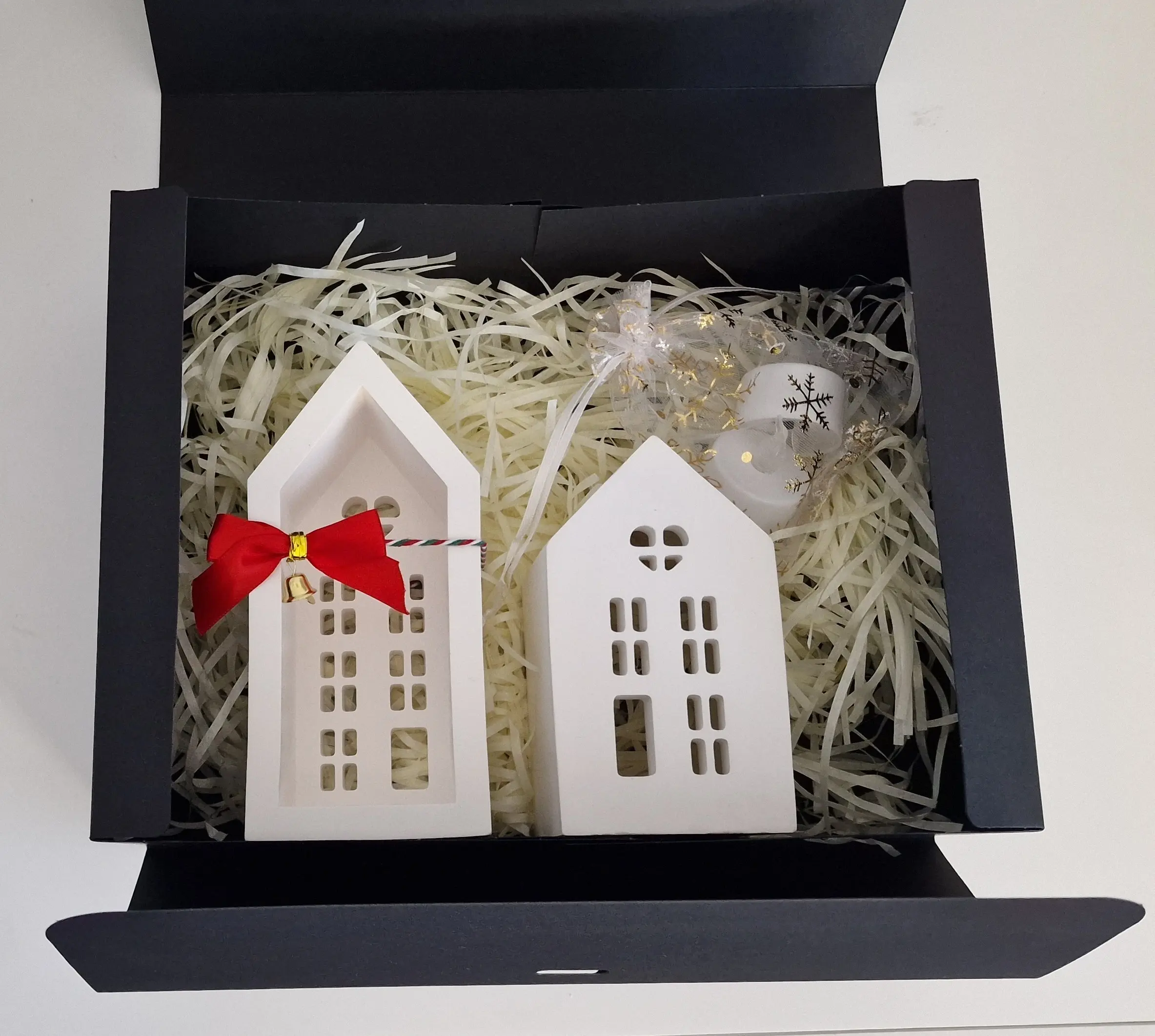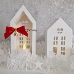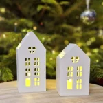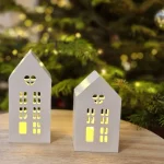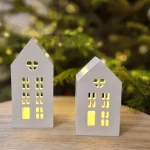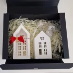 A handcrafted set of two gypsum winter houses with an LED tealight, beautifully packed in a gift box.