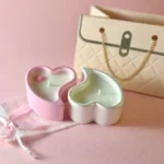 Romantisches Set aus zwei Duftkerzen in Herzform mit Himbeer- und Rosenduft. In dekorativen Schalen aus Keramikgips – perfekt als Valentinstagsgeschenk.