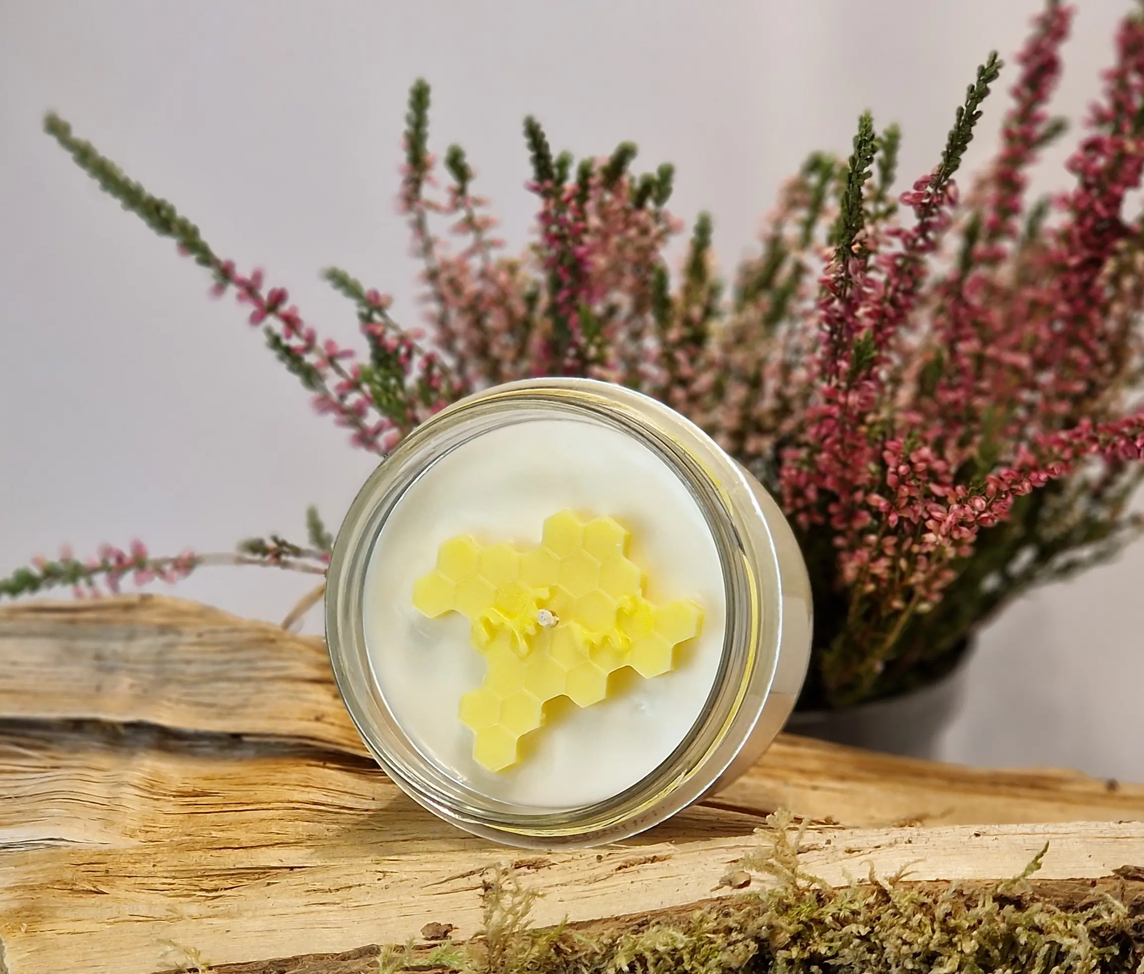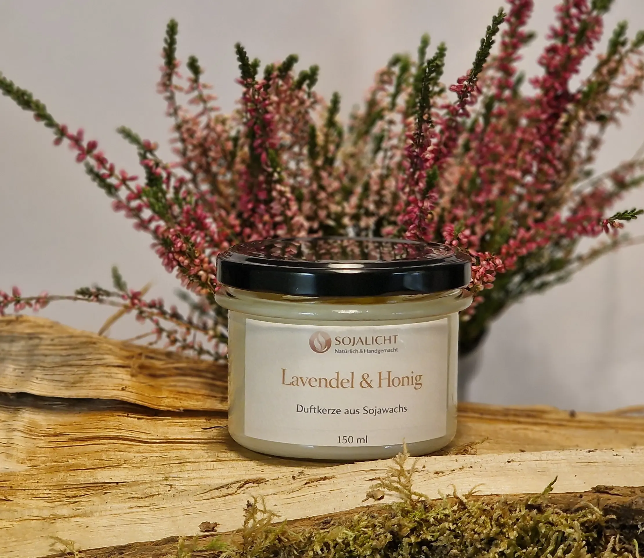 Natürliche Duftkerze aus Sojawachs mit einer harmonischen Kombination aus beruhigendem Lavendel und warmer, süßer Honignote. Diese Duftkomposition sorgt für Entspannung und schafft eine gemütliche Atmosphäre – perfekt für ruhige Abende und kleine Wohlfühlmomente.