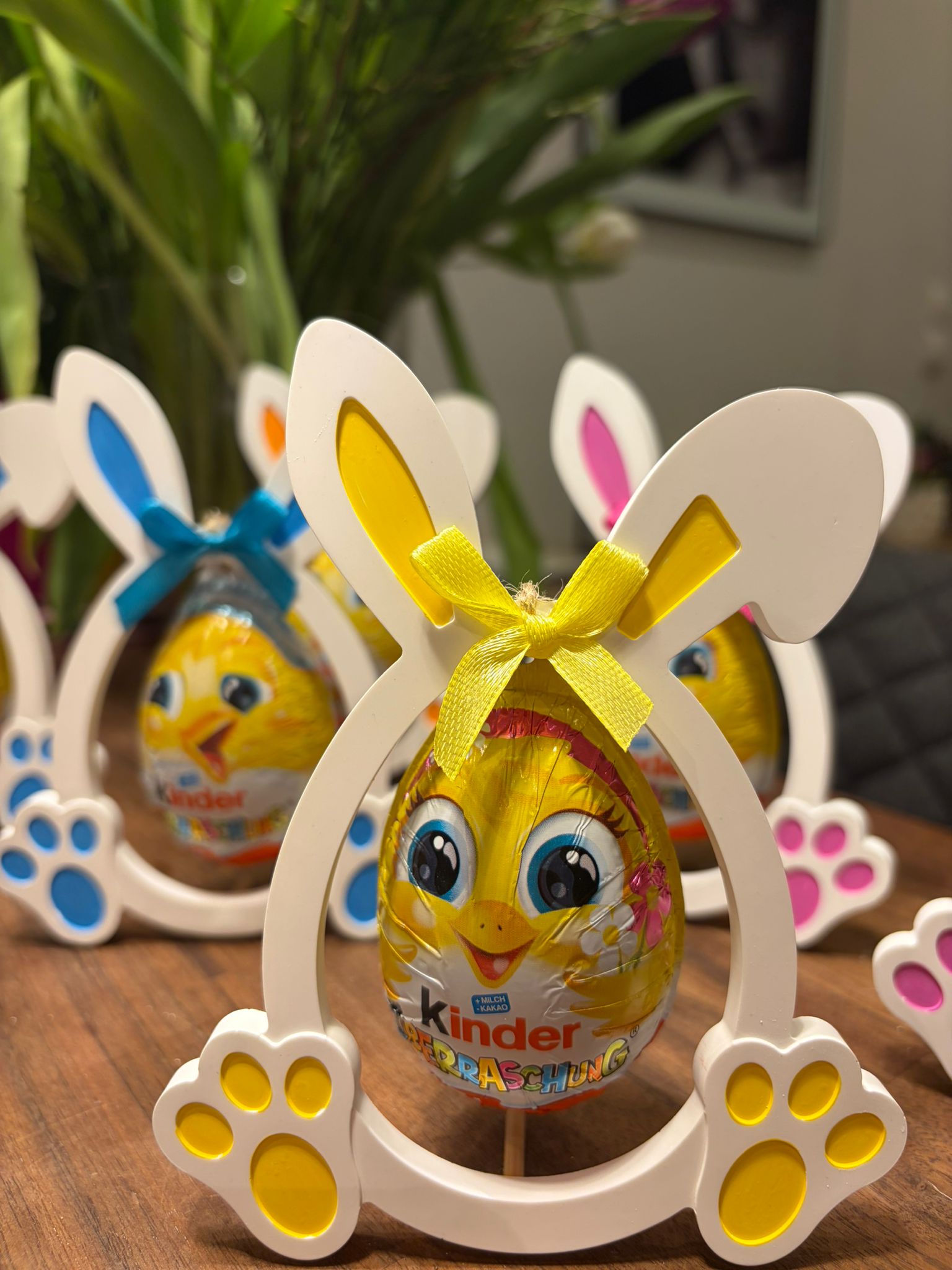Das dekorative Gestell in Form eines Hasenrahmens hält ein Schoko-Überraschungsei und wird durch eine farblich abgestimmte Schleife stilvoll ergänzt.