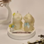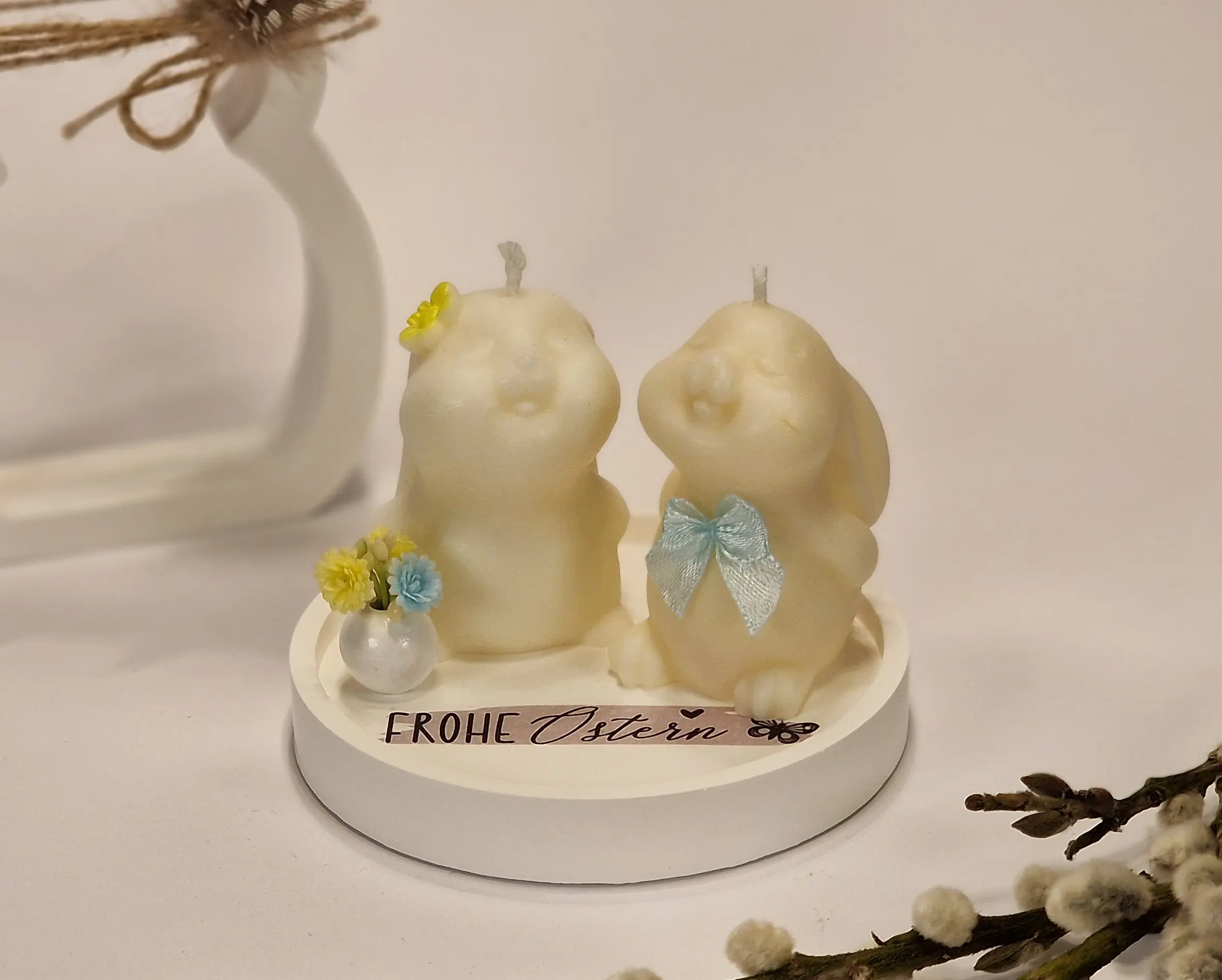 Dieses besondere Set zeigt zwei Hasen in einer romantischen Szene. Feine Details wie Blumen, Schleife und der dekorative Schale mit Schriftzug machen dieses Produkt zu einer einzigartigen Dekoration.
