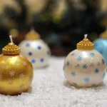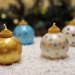 Die metallischen und perlmuttartigen Oberflächen (Gold, Weiß, Himmelblau) verleihen der Kerze einen luxuriösen Look, während reines Sojawachs ein langes, gleichmäßiges und sauberes Abbrennen garantiert.