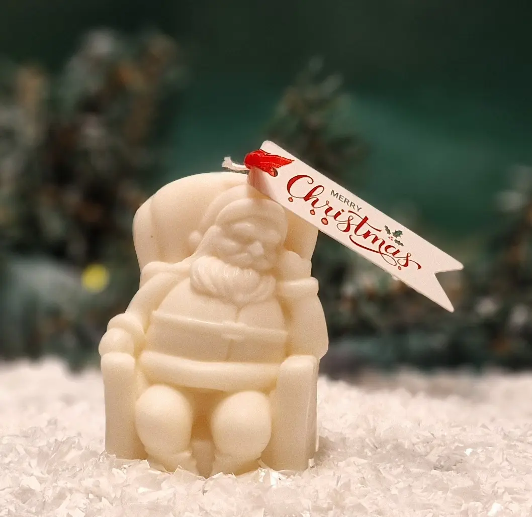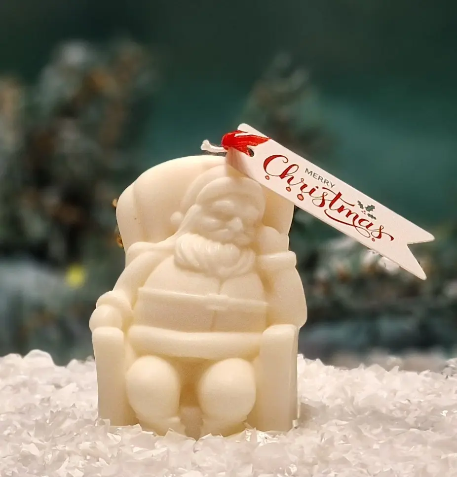 Entdecke den bezaubernden Weihnachtsmann im Sessel – eine handgefertigte Sojakerze, die weihnachtliche Wärme und Gemütlichkeit in dein Zuhause bringt.